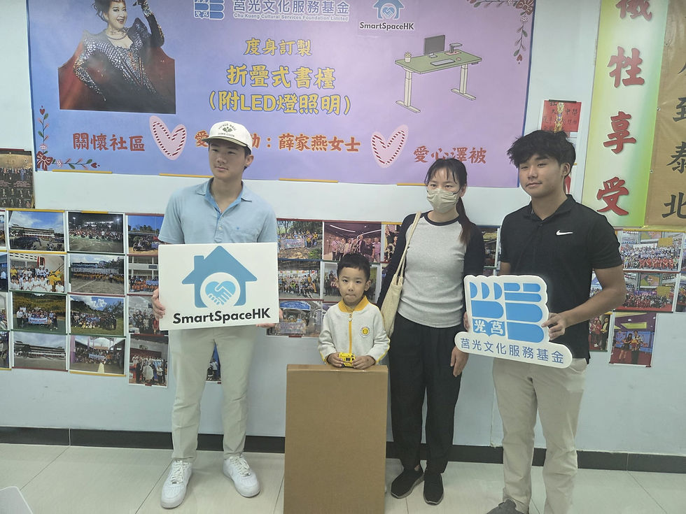 事緣負笈美國升學的年青學生溤心泰TAl,早前隨莒光探訪劏房,發現劏房學童在碌架床上,以生果紙箱屈膝做功課情景,深感震撼驚訝難過,乃夥同其他同學組成 Smart Spaee HK,並悉心度身設計摺疊式書枱,經過多月來反覆試驗及改良,才投入生產,慢工出細貨,最終竣工面世,該摺疊式流動書枱,可配合人體隨意調較高低及角度,加上配有LED照明(明.光.暗3款亮度),又附有書架設備,既靈活又實用,堪稱劏房公屋學童做功課的恩物!